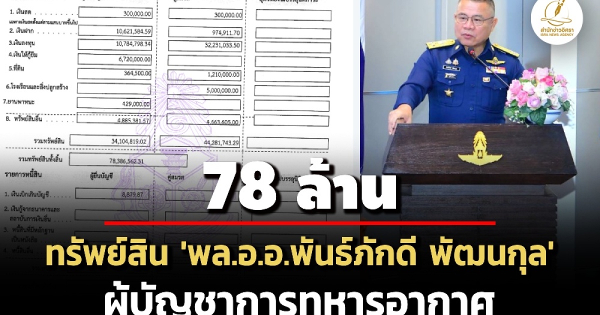 ป.ป.ช. เปิดทรัพย์สินผู้ดำรงตำแหน่งระดับสูง 'พลอากาศเอก พันธ์ภักดี พัฒนกุล' ผู้บัญชาการทหารอากาศ ทรัพย์สิน 78 ล. เงินฝาก 10 ล. รายได้ 2.5 ล./ปี