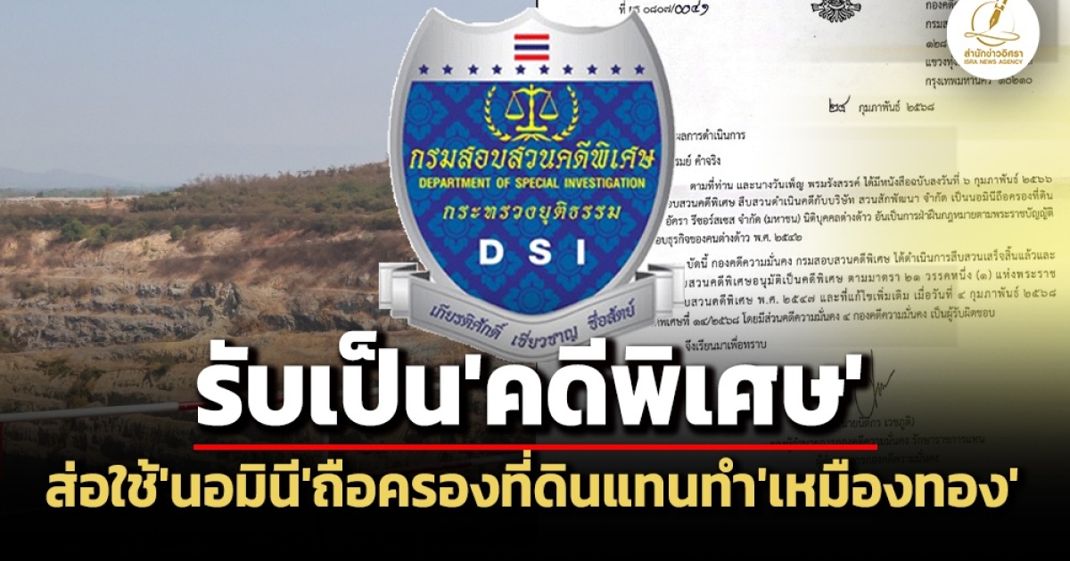 ‘อธิบดี DSI’ อนุมัติรับคดี ‘บมจ.อัคราฯ’ ส่อใช้ ‘บริษัท สวนสักพัฒนา’ เป็น ‘นอมินี’ ถือครองที่ดินแทน เพื่อทำ ‘เหมืองทองคำ’ เป็น ‘คดีพิเศษ’