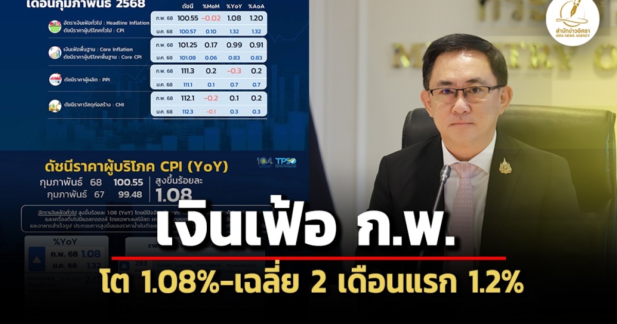 ‘พาณิชย์’ เผยอัตราเงินเฟ้อทั่วไป ก.พ.68 ขยายตัว 1.08% จากปัจจัยราคา ‘อาหาร-เครื่องดื่มไม่มีแอลกอฮอล์-ดีเซล-ค่าไฟฟ้า’ เพิ่มขึ้น ขณะที่ 'เงินเฟ้อ' เฉลี่ย 2 เดือนแรก แตะ 1.2%