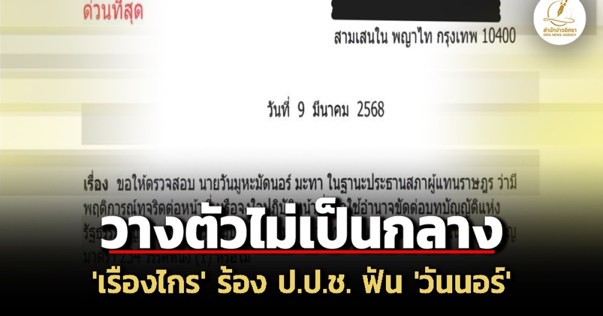 สำนักข่าวอิศรา (www.isranews.org) รายงานว่า วันที่ 9 มีนานคม 2568 นายเรืองไกร ลีกิจวัฒนะ สมาชิกพรรคพลังประชารัฐ ได้ส่งหนังสือทางไปรษณีย์ EMS เพื่อขอให้สำนักงานคณะกรรมการป้องกันและปราบปรามการทุจริตแห่งชาตอ (ป.ป.ช.) ตรวจสอบนายวันมูหะมัดนอร์ มะทา ในฐานะประธานสภาผู้แทนราษฎร ว่ามีพฤติการณ์ทุจริตต่อหน้าที่ หรือจงใจปฏิบัติหน้าที่หรือใช้อำนาจขัดต่อบทบัญญัติแห่งรัฐธรรมนูญ หรือฝ่าฝืนหรือไม่ปฏิบัติตามมาตรฐานทางจริยธรรม ตามความในรัฐธรรมนูญ มาตรา 234 วรรคหนึ่ง (1) หรือไม่ และเพื่อประโยชน์ในการทำหน้าที่ของสมาชิกสภาผู้แทนราษฎร ตามรัฐธรรมนูญ มาตรา 151 ขอให้ ป.ป.ช. มีหนังสือถึงประธานสภาผู้แทนราษฎรให้รีบบรรจุญัตติดังกล่าวตามมาตรา 151 แห่งรัฐธรรมนูญ โดยเร็วด้วย