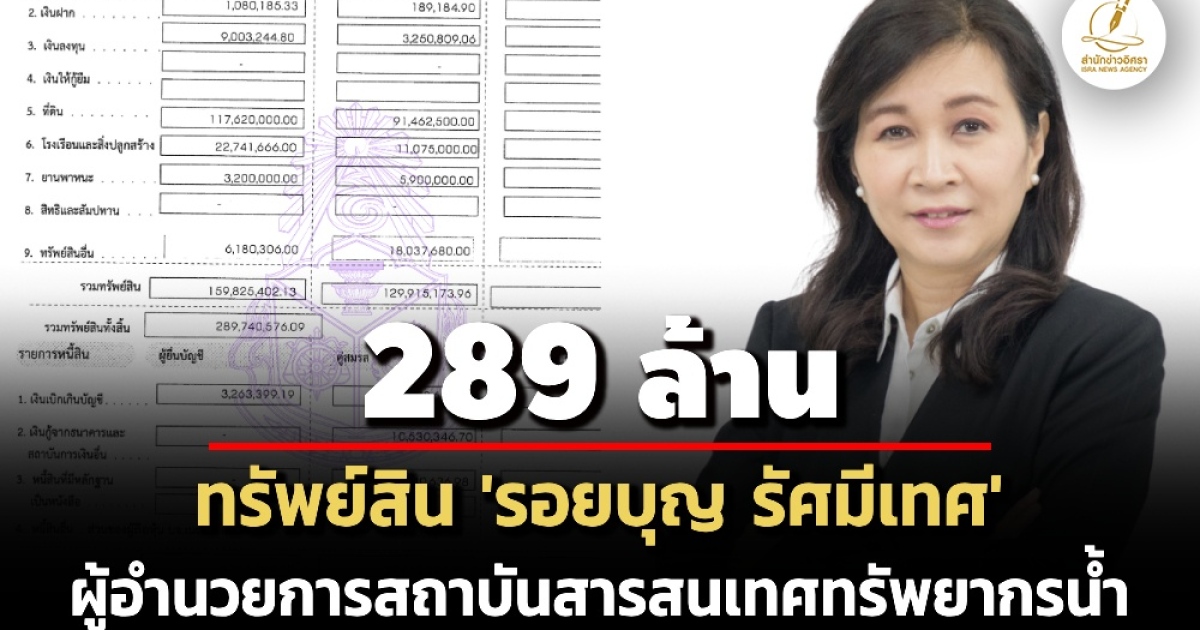 สำนักข่าวอิศรา (www.isranews.org) รายงานว่า เมื่อวันที่ 27 มี.ค. 2568 สำนักงานคณะกรรมการการป้องกันและปราบการทุจริตแห่งชาติ (ป.ป.ช.) เปิดเผยบัญชีแสดงรายการทรัพย์สินและหนี้สินผู้ดำรงตำแหน่งระดับสูง ราย นางรอยบุญ รัศมีเทศ ผู้อำนวยการสถาบันสารสนเทศทรัพยากรน้ำ (องค์การมหาชน) กรณีเข้ารับตำแหน่ง เมื่อวันที่ 1 ต.ค. 2566