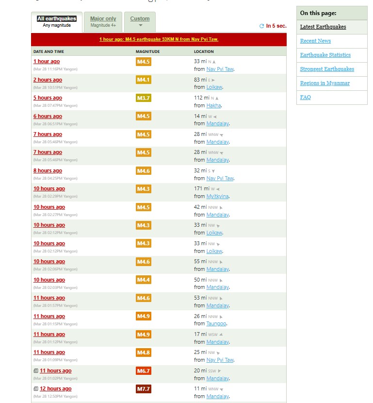 องค์กรกาชาดห่วงแผ่นดินไหวในเมียนมากระทบโครงสร้างเขื่อนในประเทศ ขณะ รบ.ทหารเมียนมาเรียกร้องขอความช่วยเหลือนานาชาติ ขณะสื่อท้องถิ่นเมียนมาเผยตัวเลขผู้เสียชีวิตในมัณฑะเลย์ตอนนี้อยู่ที่ 20 ราย