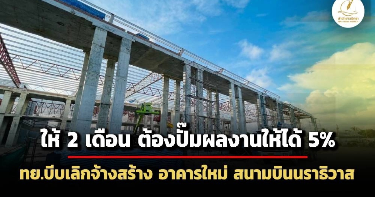 ‘มนพร’ บีบ ‘กิจการร่วมค้าซีไอเอส’ มีไชน่าเรลเวย์ 10 รวมด้วย ให้ก่อสร้าง ‘อาคารผู้โดยสารใหม่ สนามบินนราธิวาส’ ให้มีความคืบหน้า 5% ภายใน 2 เดือน ถ้าทำไม่ได้จ่อเลิกสัญญา หลังผลงานช้ากว่าแผนเกิน 60% ลากโครงการเสร็จช้า