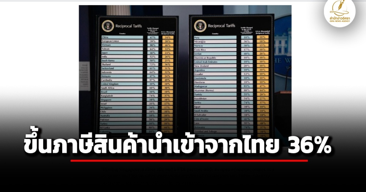 สำนักข่าวอิศรา (www.isranews.org) รายงานข่าวจากสำนักข่าวสเตรทไทม์สของสิงคโปร์ ต่อกรณีนายโดนัลด์ ทรัมป์ ประธานาธิบดีสหรัฐอเมริกาได้แถลงข่าวถึงการขึ้นภาษีจากต่างประเทศ ในหลายประเทศ โดยประเทศไทยโดนสหรัฐฯตั้งอัตราภาษีอยู่ที่ 36 %