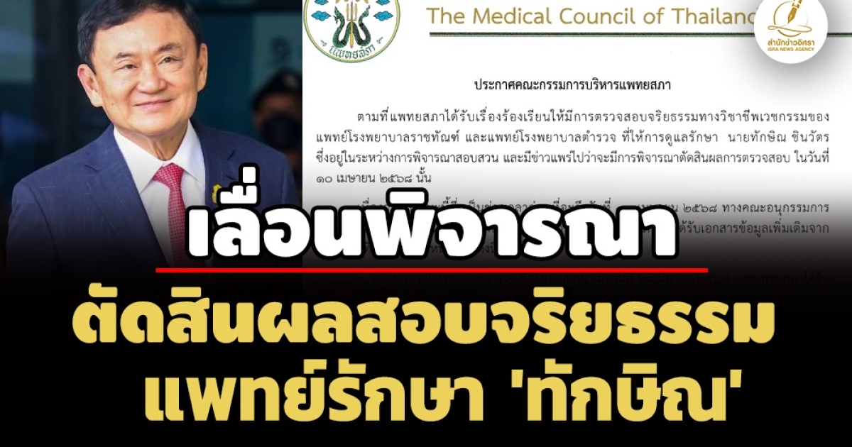 สำนักข่าวอิศรา (www.isranews.org) รายงานว่า เมื่อวันที่ 3 เมษายน 2568 ที่ผ่านมา แพทยสภา ได้ออกประกาศเลื่อนพิจารณา การตรวจสอบจริยธรรมทางวิชาชีพเวชกรรมของแพทย์โรงพยาบาลราชทัณฑ์ และแพทย์โรงพยาบาลตํารวจ ที่ให้การดูแลรักษา นายทักษิณ ชินวัตร เนื่องจากได้รับเอกสารข้อมูลเพิ่มเติมจาก โรงพยาบาลตํารวจ และโรงพยาบาลราชทัณฑ์ มีจํานวนมาก ทําให้กระบวนการพิจารณาจากข้อมูลเพิ่มเติมดังกล่าว ต้องใช้เวลามากขึ้น จึงไม่สามารถสรุปผลการตัดสินได้ทันวันที่ 10 เมษายน 2568