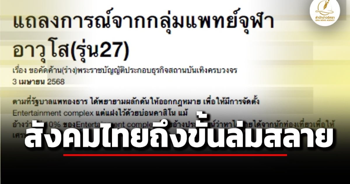 • แพทย์จุฬาอาวุโส รุ่น 27 แถลงการณ์ คัดค้าน กาสิโน: แหล่งกำเนิดอบายมุข-ประเทศชาติวิบัติ