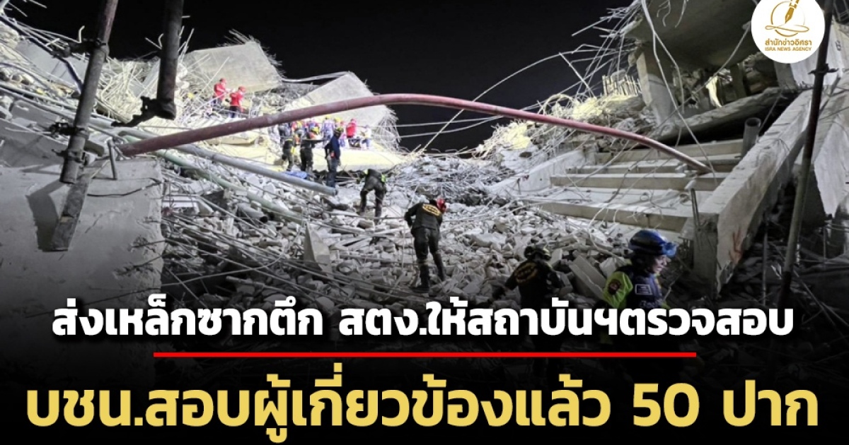 พฐ.เข้าเก็บพิสูจน์เหล็กจากซากตึก สตง. 4 โซนส่งให้สถาบันเหล็กพิสูจน์มาตรฐาน แต่ยอมรับยังไม่สามารถเก็บซากส่วนปูนโครงสร้างได้เพราะอาจกระทบแผนงานขุดเจาะช่วยผู้ติดอยู่ใต้ซากอาคาร ด้านนครบาลแจงเรียกสอบสวนผู้เกี่ยวข้องแล้ว 50 ปาก ขณะทีมยูซ่าจากแคนาดาถึงซากตึกถล่มแล้ว