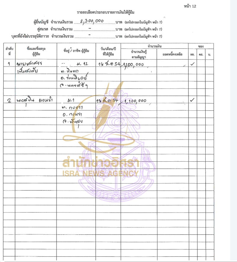 นางทิพา แจ้งมีรายได้ต่อปีโดยประมาณ 700,000 บาท ทั้งหมดเป็นรายได้จากสวนยางพารา ปาล์ม แจ้งมีรายจ่ายต่อปีโดยประมาณ 1,000,000 บาท