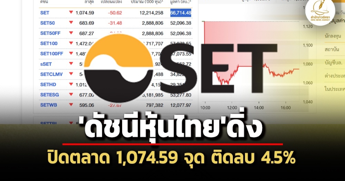 เมื่อวันที่ 8 เม.ย. สำนักข่าวอิศรา (www.isranews.org) รายงานว่า ดัชนีตลาดหลักทรัพย์ไทยวันนี้ (8 เม.ย.) เปิดตลาดในช่วงเช้าที่ 1,073.37 จุด ลดลง 51.84 และปรับลดลงสู่ระดับต่ำสุดของวัน ที่ระดับ 1,056.41 จุด ลดลง 68.80 จุด ก่อนปิดตลาดในช่วงเช้าที่ 1,077.48 จุด ลดลง 47.73 จุด หรือลดลง 4.24% ขณะที่ในช่วงบ่าย ดัชนีฯยังคงเคลื่อนไหวในแดนลบ และปิดตลาดภาคบ่ายที่ 1,074.59 จุด ลดลง -50.62 จุด หรือ -4.50% มูลค่าการซื้อขาย 66,714.48 ล้านบาท