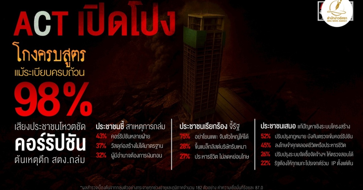 ACT ออกแถลงการณ์เผยผลสำรวจ ปชช. 98% เชื่อตึก สตง.ถล่มเอี่ยวทุจริตทั้งด้านวัสดุคุณภาพต่ำ เหล็กปลอม กำหนดแบบก่อสร้างเพื่อประโยชน์ตัวเอง รวมถึงประเด็นเงินทอน จี้ภาครัฐฟันให้ถึงตัวใหญ่ ด้านประธาน ACT ชี้ที่ผ่านมามีระบบหักหัวคิวผู้รับเหมา 30% จ่ายให้ จนท.รัฐ
