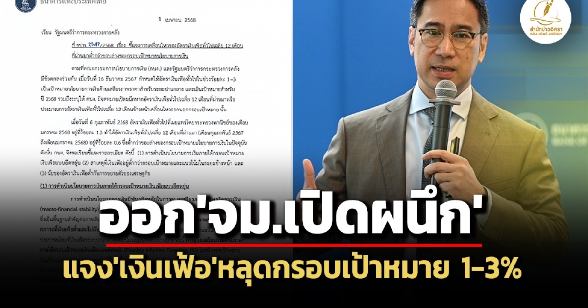 สำนักข่าวอิศรา (www.isranews.org) รายงานว่า เมื่อวันที่ 1 เม.ย.ที่ผ่านมา ธนาคารแห่งประเทศไทย (ธปท.) โดยนายเศรษฐพุฒิ สุทธิวาทนฤพุฒิ ผู้ว่าการ ธปท. ในฐานะประธานคณะกรรมการนโยบายการเงิน (กนง.) ได้ออกจดหมายเปิดผนึกถึง รมว.คลัง ที่ ธปท. 2347/2568 เรื่อง ชี้แจงการเคลื่อนไหวของอัตราเงินเฟ้อทั่วไปเฉลี่ย 12 เดือนที่ผ่านมาต่ำกว่าขอบล่างของกรอบเป้าหมายนโยบายการเงิน โดยมีเนื้อหาว่า