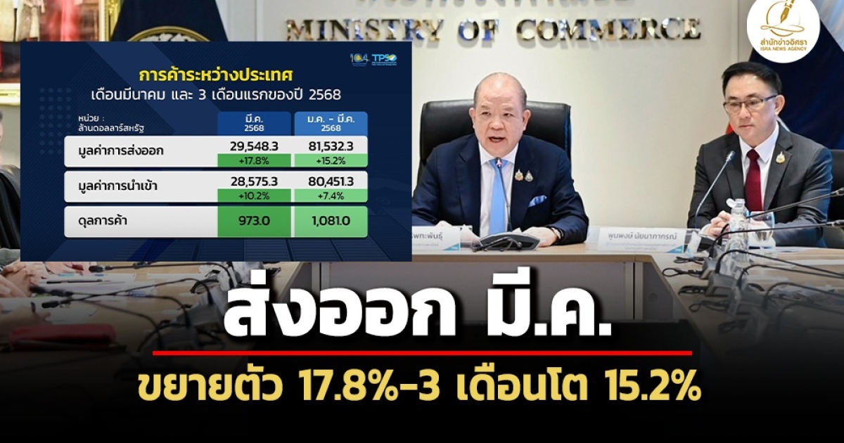 ‘พาณิชย์’ เผยตัวเลขส่งออกไทย มี.ค.68 ขยายตัว 17.8% เหตุภาคอุตสาหกรรม ‘สหรัฐ-จีน-ยุโรป’ เร่งนำเข้า ลดความเสี่ยง ‘ภาษีทรัมป์’ ขณะที่ยอดส่งออก 3 เดือนแรกโต 15.2% ‘พิชัย’ มองวิกฤตเป็นโอกาส คาดส่งออกทั้งปี 68 เกิน 2-3%