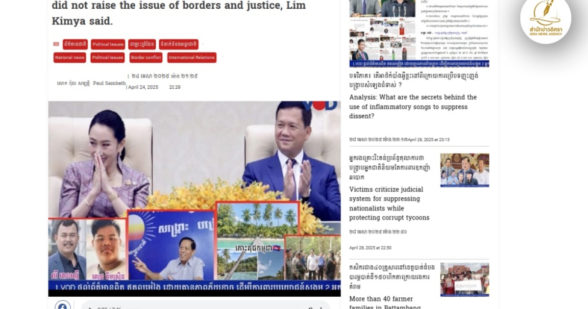 สำนักข่าวอิศรา (www.isranews.org) รายงานข่าวความเคลื่อนไหวจากกัมพูชาต่อกรณีที่ น.ส.แพทองธาร ชินวัตร นายกรัฐมนตรีไทยได้ไปเยือน พล.อ.ฮุน มาเนต วันที่ 23 เม.ย.ที่ผ่านมา โดยมีการลงนามในความร่วมมือกันหลายประการ อย่างไรก็ตามนาย Ou Chanrath ร่วมก่อตั้งพรรคปฏิรูปกัมพูชา ซึ่งเป็นพรรคฝ่ายค้านกัมพูชาตั้งข้อสังเกตว่าทั้งๆที่ครอบครัวของนายทักษิณ ชินวัตร และครอบครัวของอดีตนายกรัฐมนตรีฮุนเซนมีความสัมพันธ์ที่ลึกซึ้งแต่กลับไม่มีการพูดถึงประเด็นเรื่องเกาะกูด และกรณีการสังหารนายลิม คิยา สมาชิกพรรคฝ่ายค้านกัมพูชาเลย ซึ่งเป็นเรื่องที่ทั้งสองควรทำ