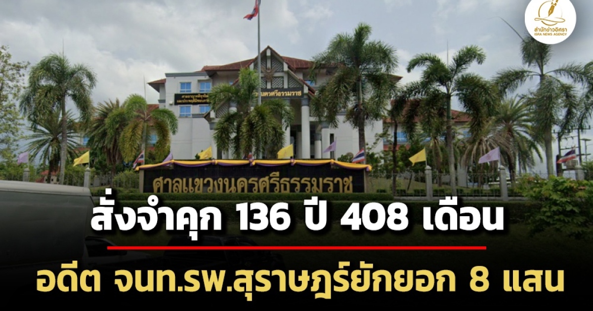 ศาลอาญาคดีทุจริตฯภาค 8 พิพากษาจำคุก 136 ปี 408 เดือน แต่ติดจริง 50 ปี พร้อมให้ชดใช้เงินคืนเต็มจำนวน-อดีต จนท.การเงิน รพ.สุราษฎร์ธานี ยักยอกเงิน 887,704.24 บาท