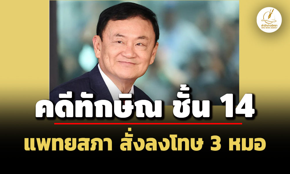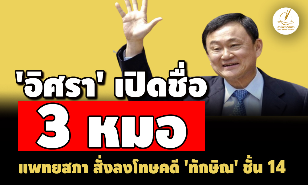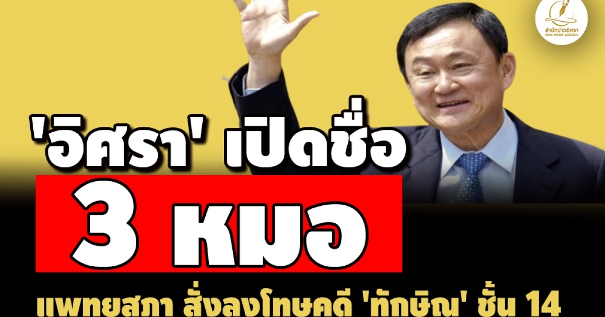 'อิศรา' ได้มาแล้ว! เปิดรายชื่อ 3 หมอ โดนแพทยสภา ลงมติสั่งลงโทษคดีทักษิณ ชั้น 14 'รวมทิพย์ สุภานันท์' โรงพยาบาลราชทัณฑ์ เจอตักเตือน เหตุเขียนใบส่งตัวล่วงหน้า อีก 2 'พลตำรวจโท โสภณรัชต์ สิงหจารุ - พลตำรวจโท ทวีศิลป์ เวชวิทารณ์' พักใบอนุญาต แต่ต้องรอเสนอที่ประชุมสภานายกพิเศษ รมว.สาธารณสุข พิจารณาผลอีกครั้งก่อน ด้าน ป.ป.ช.เตรียมขอสำนวน ประกอบการไต่สวนคดีเอื้อประโยชน์ด้วย