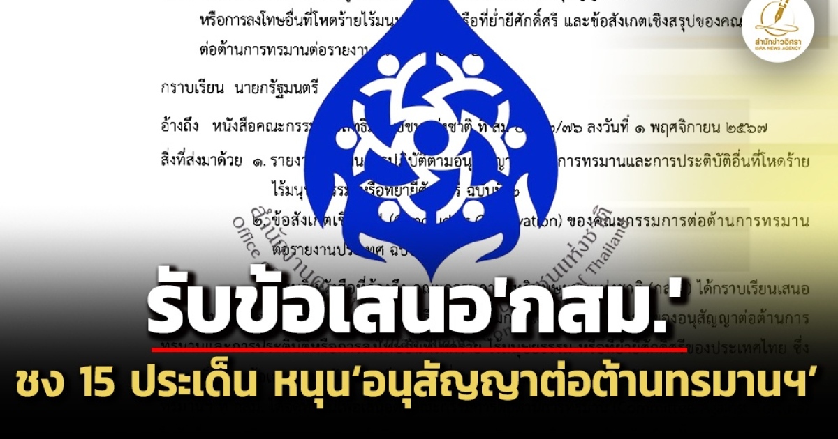 สำนักข่าวอิศรา (www.isranews.org) รายงานว่า ในการประชุมคณะรัฐมนตรี (ครม.) เมื่อวันที่ 13 พ.ค.ที่ผ่านมา ครม. มีมติรับทราบข้อเสนอแนะตามรายงานคู่ขนานการปฏิบัติตามพันธกรณีของอนุสัญญาต่อต้านการทรมานและการประติบัติหรือการลงโทษอื่นที่โหดร้าย ไร้มนุษยธรรม หรือที่ย่ำยีศักดิ์ศรี และข้อสังเกตเชิงสรุปของคณะกรรมการต่อต้านการทรมานต่อรายงานประเทศ ฉบับที่ 2 ตามที่คณะกรรมการสิทธิมนุษยชนแห่งชาติ (กสม.) เสนอ
