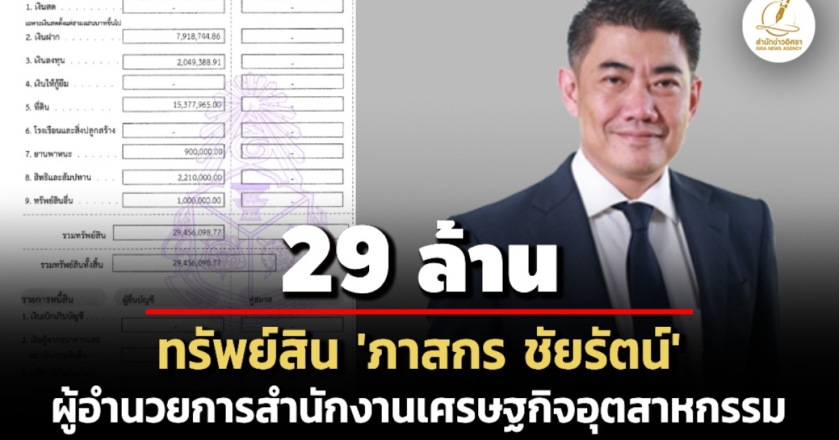 ป.ป.ช. เปิดทรัพย์สินผู้ดำรงตำแหน่งระดับสูง 'ภาสกร ชัยรัตน์' ผู้อำนวยการสำนักงานเศรษฐกิจอุตสาหกรรม ทรัพย์สิน 29 ล. ที่ดิน 15 ล. รายได้ 1.7 ล./ปี ไร้หนี้สิน