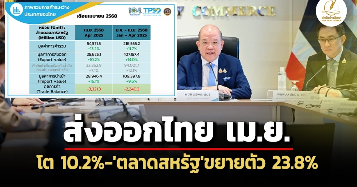 ‘พาณิชย์’ เผยส่งออก เม.ย.68 เติบโต 10.2% ขยายตัวต่อเนื่องเป็นเดือนที่ 10 เผยส่งออกไป ‘ตลาดสหรัฐ’ โต 23.8% ขณะที่ 4 เดือนแรก ไทยขาดดุลการค้า 2.24 พันล้านดอลล์ เฉพาะเดือน เม.ย. ขาดดุลฯ 3.32 พันล้านดอลล์