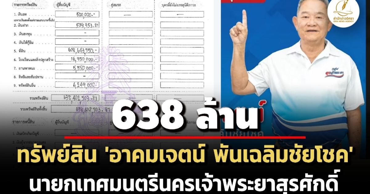 ป.ป.ช. เปิดทรัพย์สินองค์กรปกครองส่วนท้องถิ่น 'อาคมเจตน์ พันเฉลิมชัยโชค' นายกเทศมนตรีนครเจ้าพระยาสุรศักดิ์ กรณีพ้นตำแหน่ง ทรัพย์สิน 638 ล. ที่ดิน 608 ล. รายได้ 9.5 แสน/ปี