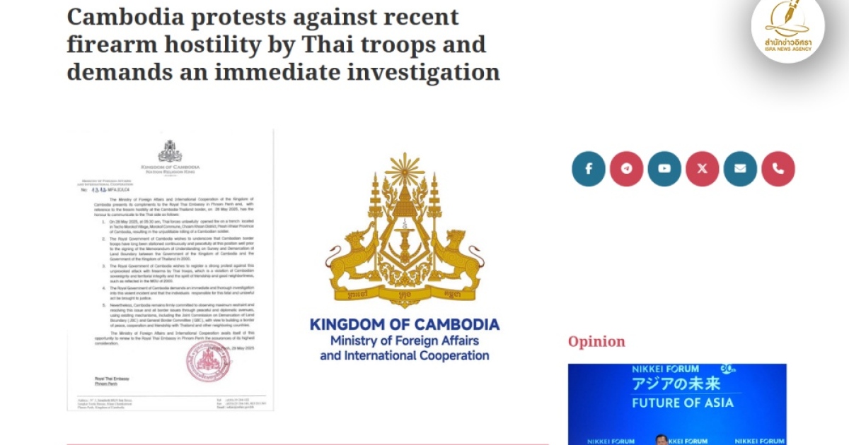 กต.กัมพูชาทำหนังสือถึงสถานทูตไทย จี้สอบสวนเหตุปะทะ 28 พ.ค.จนเป็นเหตุทหารกัมพูชาเสียชีวิต 1 ราย ย้ำกองทัพไทยละเมิดอธิปไตย-MOU ปี 43 ยืนยันกัมพูชายังยึดหลักการสันติวิธี