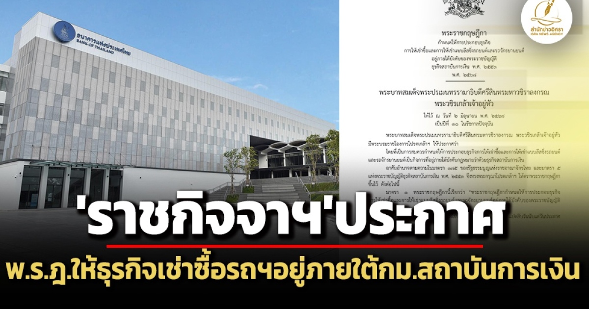สำนักข่าวอิศรา (www.isranews.org) รายงานว่า เมื่อวันที่ 5 มิ.ย.ที่ผ่านมา เว็บไซต์ราชกิจจานุเบกษาได้ เผยแพร่พระราชกฤษฎีกา (พ.ร.ฎ.) กำหนดให้การประกอบธุรกิจการให้เช่าซื้อและการให้เช่าแบบลีสซิ่งรถยนต์และรถจักรยานยนต์อยู่ภายใต้บังคับของพระราชบัญญัติธุรกิจสถาบันการเงิน พ.ศ.2551 พ.ศ.2568 และให้ พ.ร.ฎ.ดังกล่าว มีบังคับเมื่อพ้นกำหนด 180 วัน นับแต่วันประกาศในราชกิจจานุเบกษาเป็นต้นไป