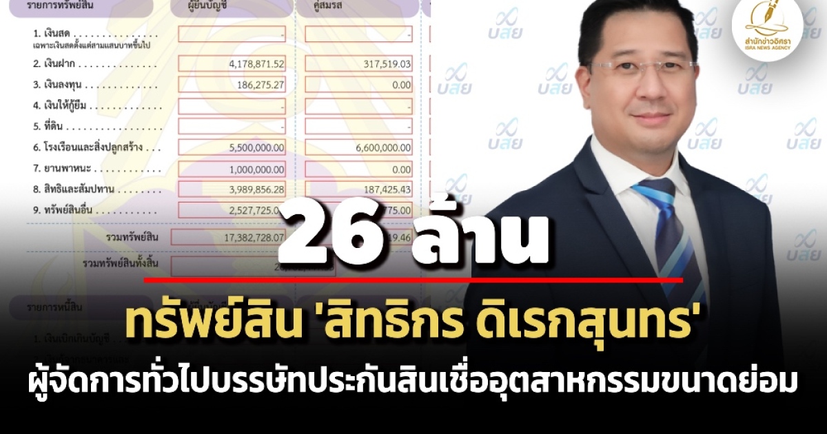 ป.ป.ช. เปิดทรัพย์สินผู้ดำรงตำแหน่งระดับสูง 'สิทธิกร ดิเรกสุนทร' ผู้จัดการทั่วไปบรรษัทประกันสินเชื่ออุตสาหกรรมขนาดย่อม ทรัพยสิน 26 ล. รายได้ 8.1 ล./ปี