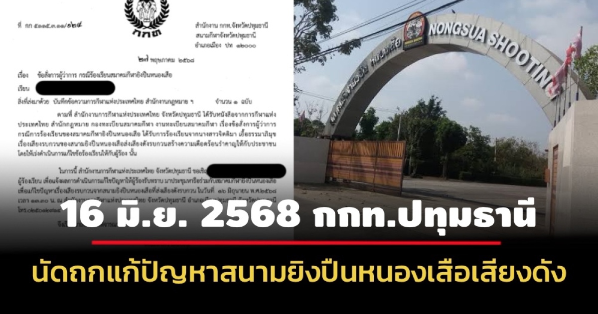 นอกจากนี้เมื่อวันที่ 20 พ.ค. 2568 ผู้ว่าการการกีฬาแห่งประเทศไทย ยังมีบันทึกข้อความข้อสั่งการให้ผู้อำนวยการสำนักงาน กกท. จังหวัดปทุมธานี ในฐานะนายทะเบียนสมาคมกีฬาประจำจังหวัดปทุมธานี เร่งดำเนินการแก้ไขปัญหาข้อร้องเรียนของผู้ร้องเรียน เรื่องเสียงรบกวนของสนามยิงปืนหนองเสือส่งเสียงดังรบกวนสร้างความเดือดร้อนรำคาญให้กับประชาชนโดยให้ปฏิบัติตามขั้นตอนการดำเนินงาน ดังนี้