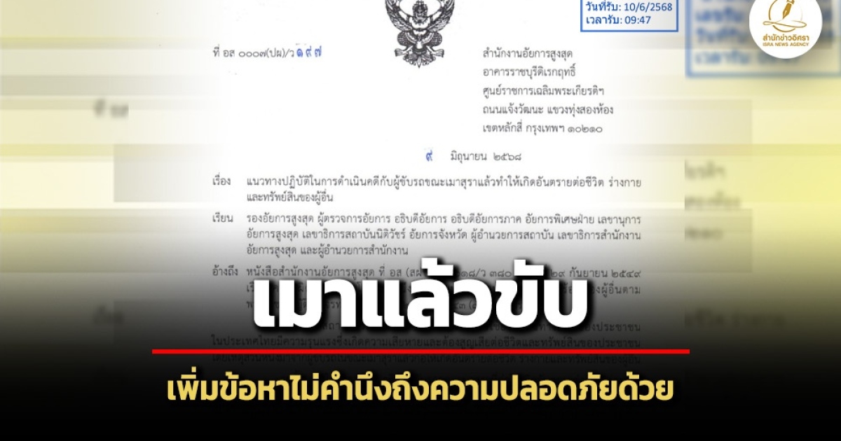 อัยการสูงสุดส่งหนังสือเวียนแจ้งแนวทางปฏิบัติตามในการดำเนินคดี เมาแล้วขับ ให้แจ้งข้อหาขับรถโดยไม่คำนึงถึงความปลอดภัยหรือความเดือดร้อนของผู้อื่นเพิ่มด้วย