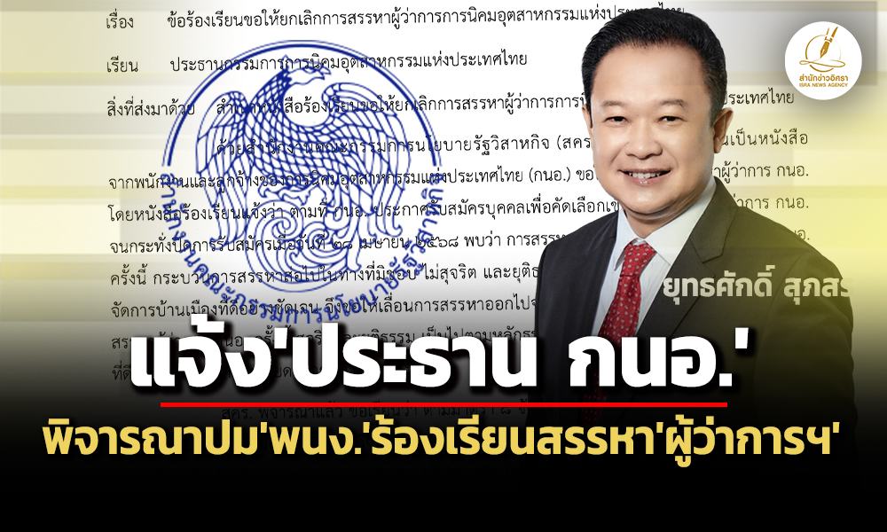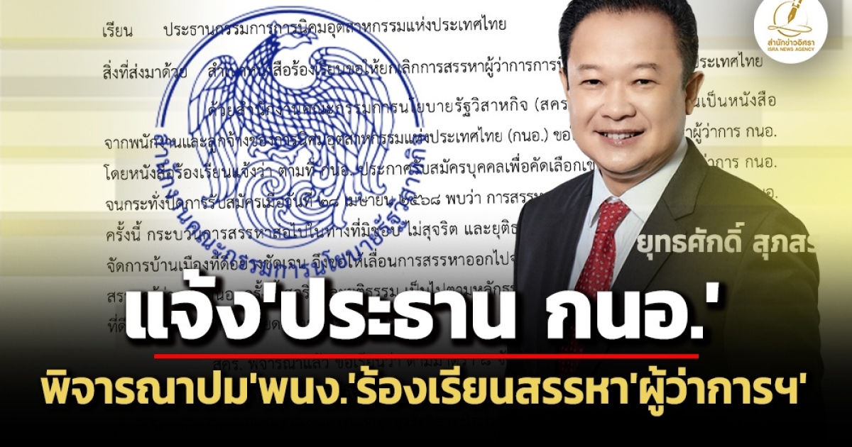 “ด้วยสำนักงานคณะกรรมการนโยบายรัฐวิสาหกิจ (สคร.) ได้รับข้อร้องเรียนเป็นหนังสือ จากพนักงานและลูกจ้างของการนิคมอุตสาหกรรมแห่งประเทศไทย (กนอ.) ขอให้ยกเลิกการสรรหาผู้ว่าการ กนอ. โดยหนังสือร้องเรียนแจ้งว่า ตามที่ กนอ. ประกาศรับสมัครบุคคลเพื่อคัดเลือกเข้าดำรงตำแหน่งผู้ว่าการ กนอ. จนกระทั่งปิดการรับสมัครเมื่อวันที่ 28 เม.ย.2568 พบว่า การสรรหาบุคคลเข้าดำรงตำแหน่งผู้ว่าการ กนอ. ครั้งนี้