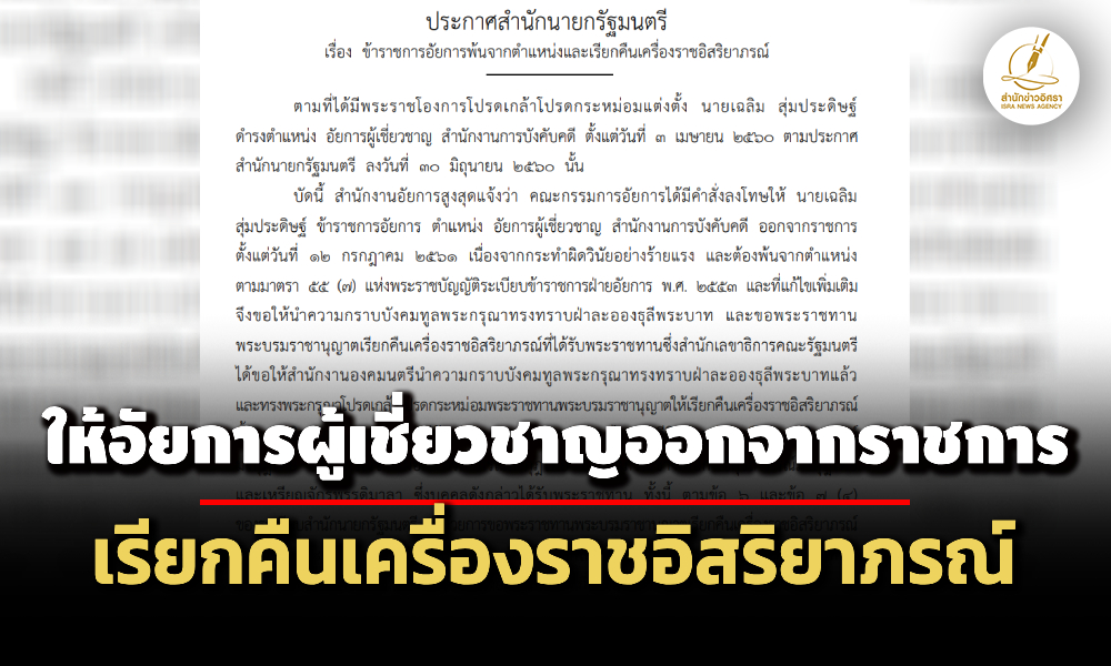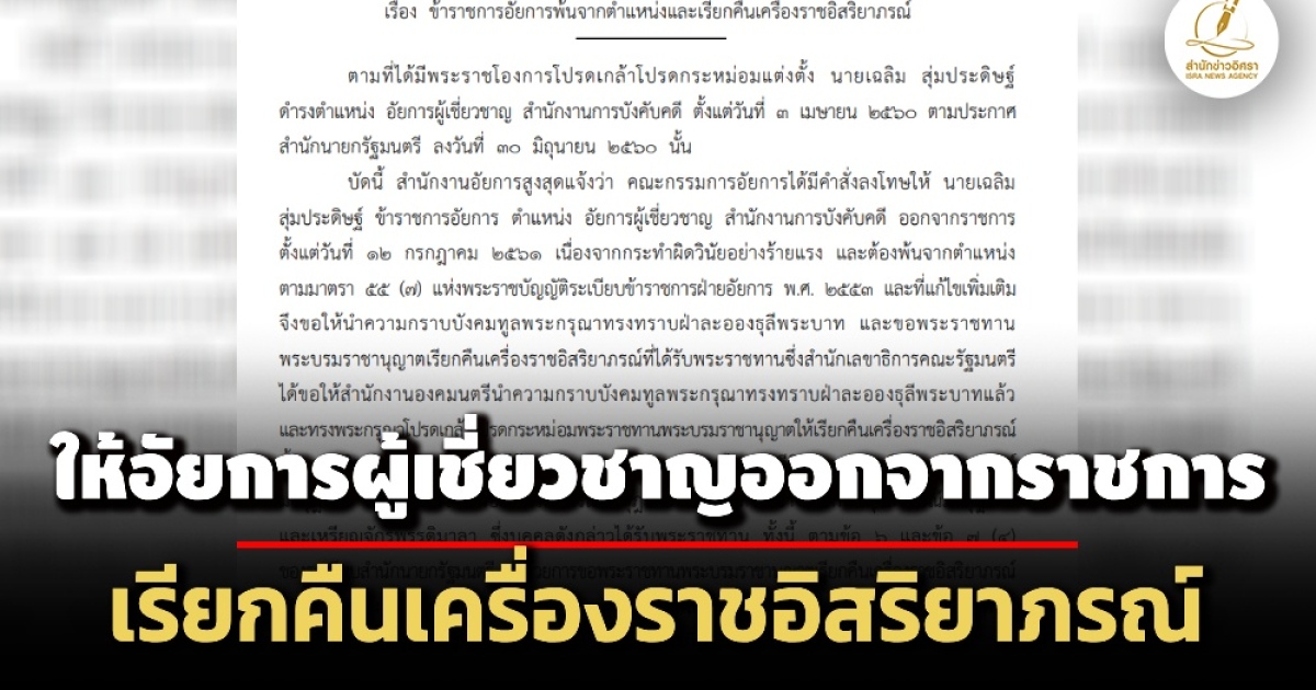 ราชกิจจานุเบกษา แพร่ประกาศให้ 'เฉลิม สุ่มประดิษฐ์' อัยการผู้เชี่ยวชาญออกจากราชการ-เรียกคืนเครื่องราชฯ เหตุทำผิดวินัยร้ายแรง