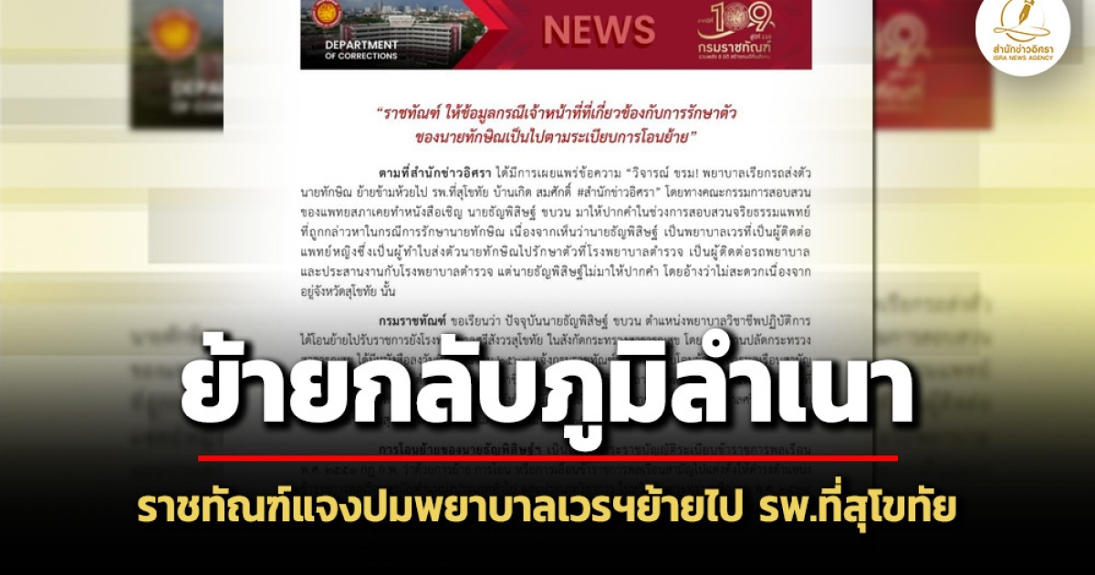 กรมราชทัณฑ์ แจงกรณีพยาบาลเวรฯ เรียกรถส่งตัว'ทักษิณ' ย้ายข้ามห้วยไป รพ.ที่สุโขทัย ยันเป็นไปตามระเบียบ เจ้าตัวให้เหตุผล เพื่อเพิ่มพูนประสบการณ์-กลับไปดูแลพ่อแม่ที่ภูมิลำเนา