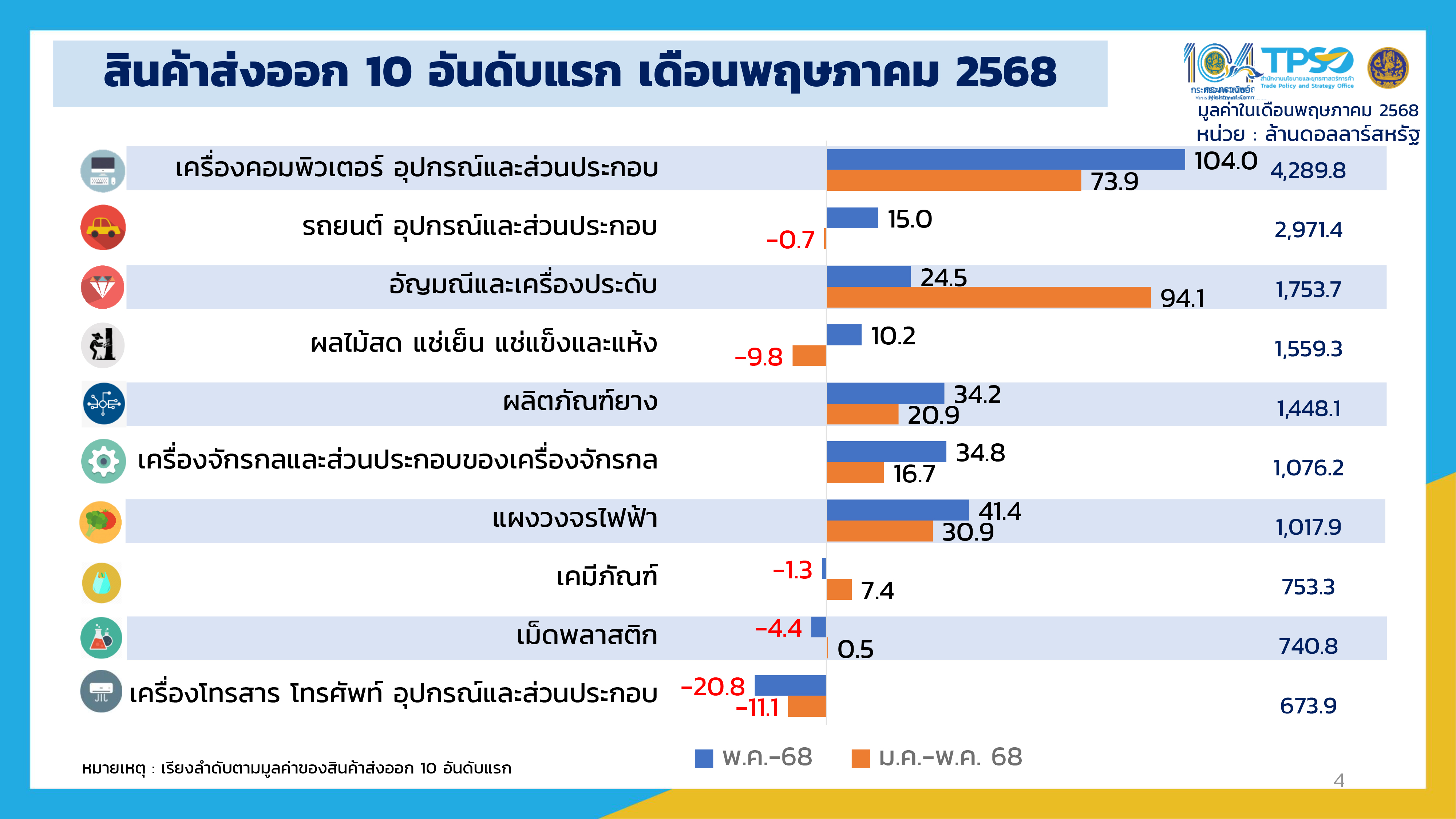 รายงานข่าวแจ้งว่า สำนักงานนโยบายและยุทธศาสตร์การค้า (สนค.) ระบุว่า การส่งออกของไทยในเดือน พ.ค. 2568 ที่ขยายตัว 18.4% นั้น เป็นการขยายตัวต่อเนื่องเป็นเดือนที่ 11 และเป็นอัตราการขยายตัวสูงสุดในรอบ 38 เดือน นับตั้งแต่เดือน มี.ค.2565 อีกทั้งมีมูลค่าการส่งออกรายเดือนสูงสุดในประวัติศาสตร์ โดยมีสาเหตุจากการชะลอการบังคับใช้ภาษีศุลกากรต่างตอบแทนของสหรัฐฯ ซึ่งส่งผลให้การส่งออกเร่งตัวขึ้นอย่างต่อเนื่อง