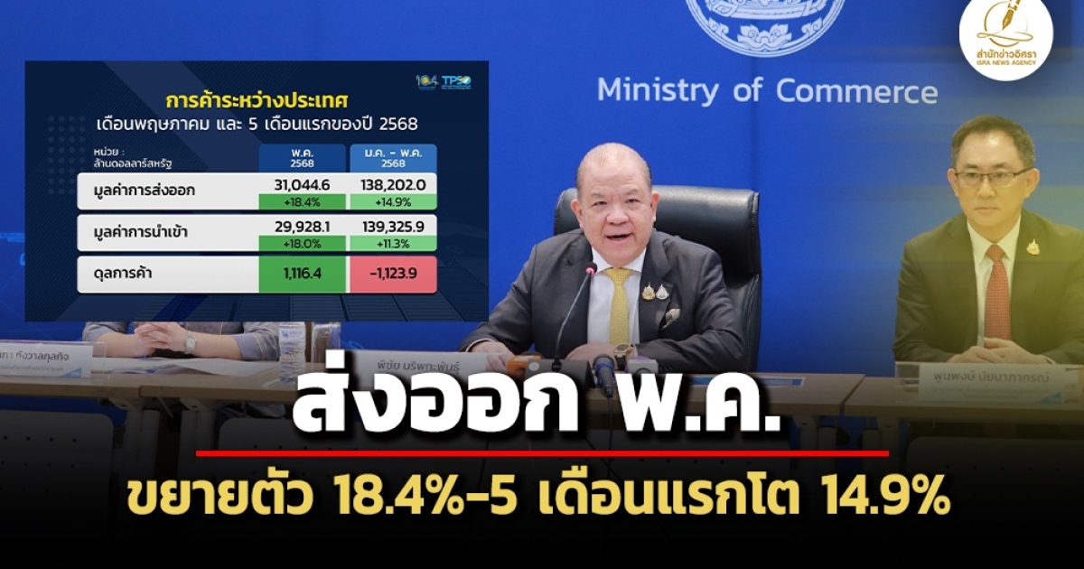 เมื่อวันที่ 18 มิ.ย. นายพิชัย นริพทะพันธุ์ รมว.พาณิชย์ แถลงภาวะการค้าระหว่างประเทศของไทย เดือน พ.ค. 2568 ว่า การส่งออกไทยเดือน พ.ค.2568 มีมูลค่า 31,044.6 ล้านดอลลาร์สหรัฐ ขยายตัว 18.4% เมื่อเทียบกับช่วงเดียวกันของปีก่อน ส่วนการนำเข้า มีมูลค่า 29,928.1 ล้านดอลลาร์สหรัฐ ขยายตัว 18% ส่งผลให้ในเดือน พ.ค.2568 ไทยเกินดุลการค้า 1,116.4 ล้านดอลลาร์สหรัฐ
