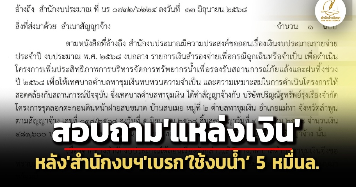 นายกเทศฯ‘ทาขุมเงิน’ ร่อนหนังสือถาม ‘ผอ.สำนักงบประมาณ’ แจงแนวทางเบิกจ่ายเงินฯ-แหล่งเงิน หลังสั่งเบรก ‘งบน้ำ’ 5 หมื่นล้าน รอ 'ป.ป.ช.' ตรวจสอบ