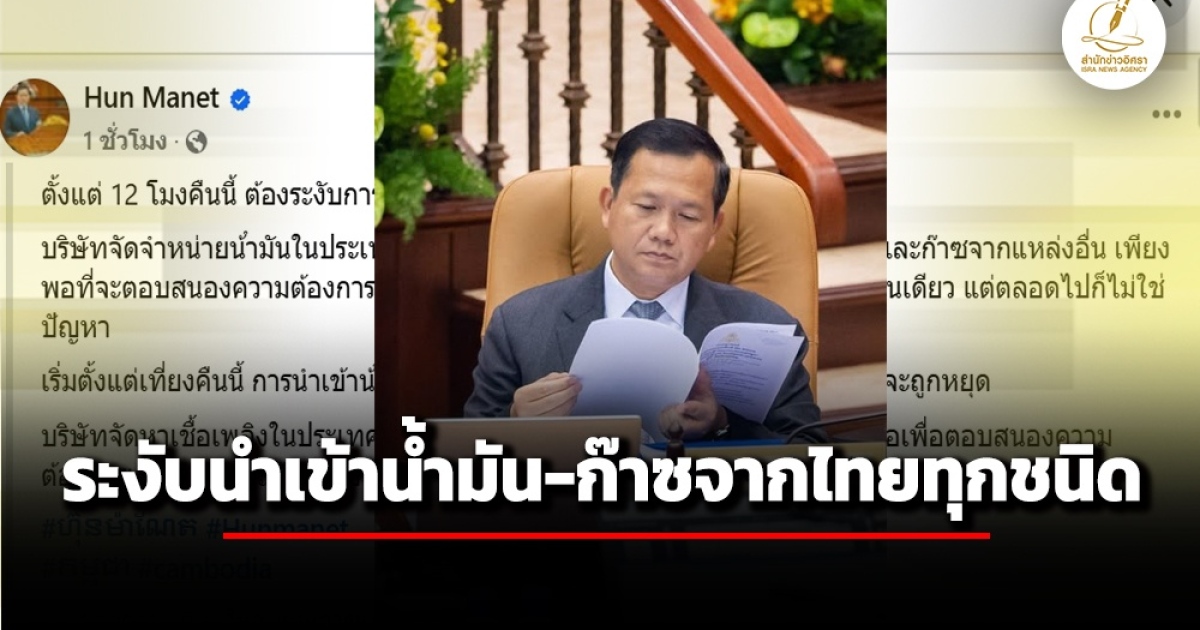 ฮุน มาเนต นายกรัฐมนตรีกัมพูชา โพสต์เฟซบุ๊ก ระงับการนำเข้าน้ำมันและก๊าซทุกชนิดจากประเทศไทย ตั้งแต่เที่ยงคืนเป็นต้นไป ระบุ มีแหล่งน้ำมันอื่นสำรองแม้เดือนเดียว-ตลอดไป ไม่ใช่ปัญหา