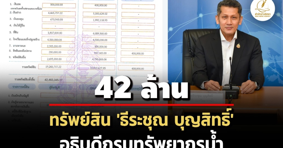 ป.ป.ช. เปิดทรัพยืสินผู้ดำรงตำแหน่งระดับสูง 'ธีระชุณ บุญสิทธิ์' อธิบดีกรมทรัพยากรน้ำ ทรัพย์สิน 42 ล. เงินฝาก 4.4 ล. รายได้ 2 ล./ปี