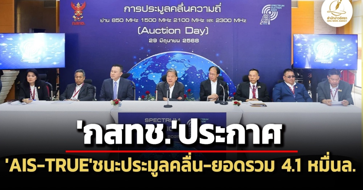 ‘กสทช.’ ประกาศผลประมูลคลื่นฯ AIS คว้าคลื่น ‘ย่าน 2100 MHz’ มูลค่า 1.48 หมื่นล. ขณะที่ TRUE ชนะประมูลย่าน ‘1500 MHz-2300 MHz’ รวม 2.65 หมื่นล้าน ชง ‘บอร์ด’ รับรองผลการประมูลฯ 2 ก.ค.นี้ เริ่มต้นอนุญาตให้ใช้คลื่นความถี่ฯ 4 ส.ค.68