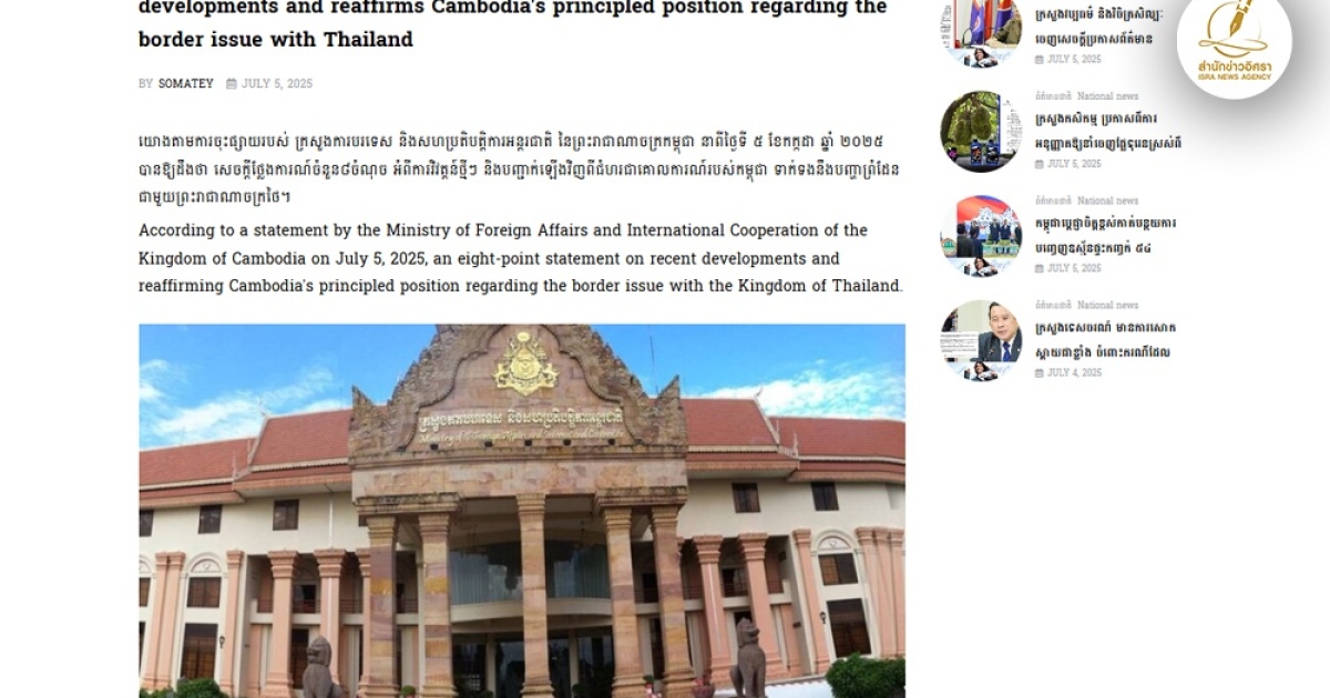 ตามแถลงการณ์ของกระทรวงการต่างประเทศและความร่วมมือระหว่างประเทศแห่งราชอาณาจักรกัมพูชาเมื่อวันที่ 5 กรกฎาคม 2568 ซึ่งเป็นแถลงการณ์ 8 ประเด็นเกี่ยวกับการพัฒนาที่เกิดขึ้นล่าสุดและยืนยันจุดยืนตามหลักการของกัมพูชาเกี่ยวกับปัญหาชายแดนกับราชอาณาจักรไทย
