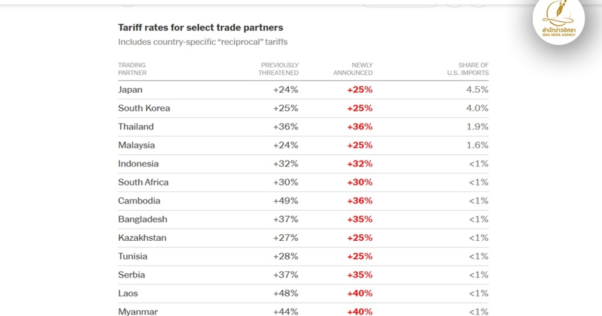 สำนักข่าวอิศรา (www.isranews.org) รายงานข่าวสถานการณ์เกี่ยวกับการออกมาตรการเก็บภาษีตอบโต้ของนายโดนัลด์ ทรัมป์ ประธานาธิบดีสหรัฐฯ อเมริกาว่านายทรัมป์ได้ออกประกาศมาตรการเก็บภาษีสินค้านำเข้ากับ 14 ประเทศ รวมถึงกับประเทศไทยที่ถูกเก็บภาษีที่ 36% มีผลตั้งแต่วันที่ 1 ส.ค.