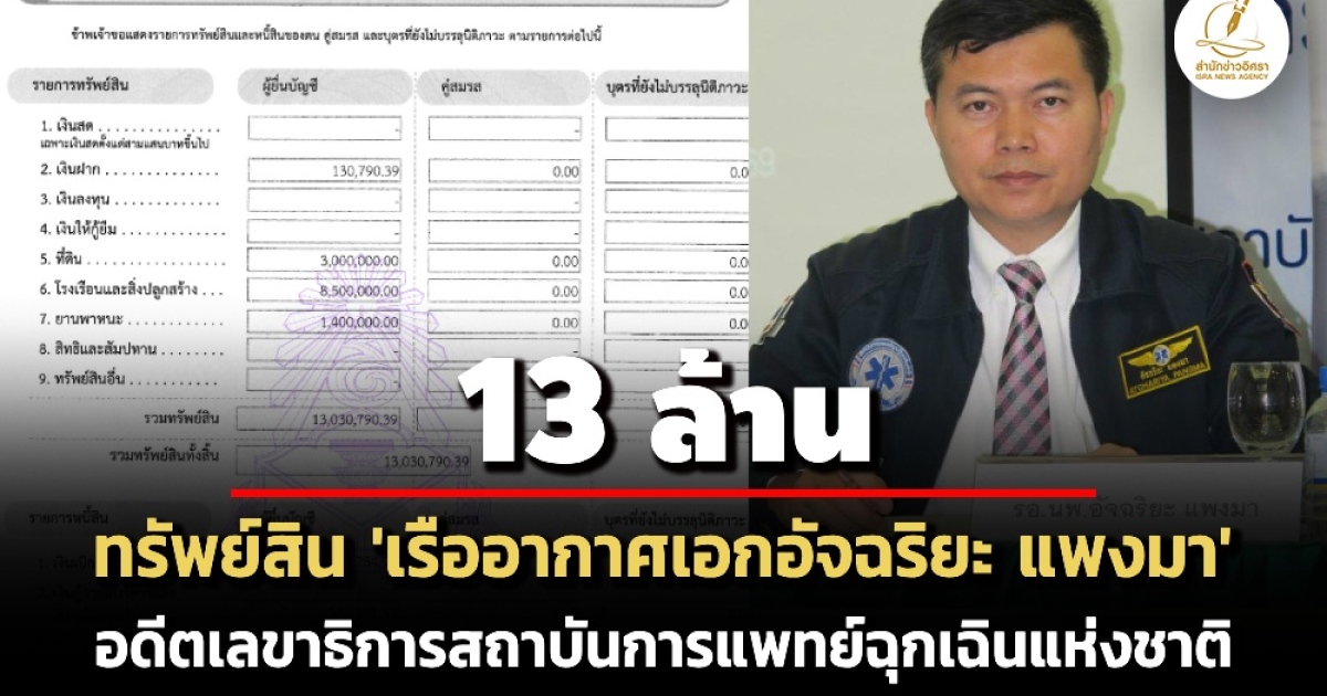 ป.ป.ช. เปิดทรัพย์สินผู้ดำรงตำแหน่งระดับสูง 'เรืออากาศเอกอัจฉริยะ แพงมา' อดีตเลขาธิการสถาบันการแพทย์ฉุกเฉินแห่งชาติ ทรัพย์สิน 13 ล. รายได้ 3.6 ล./ปี
