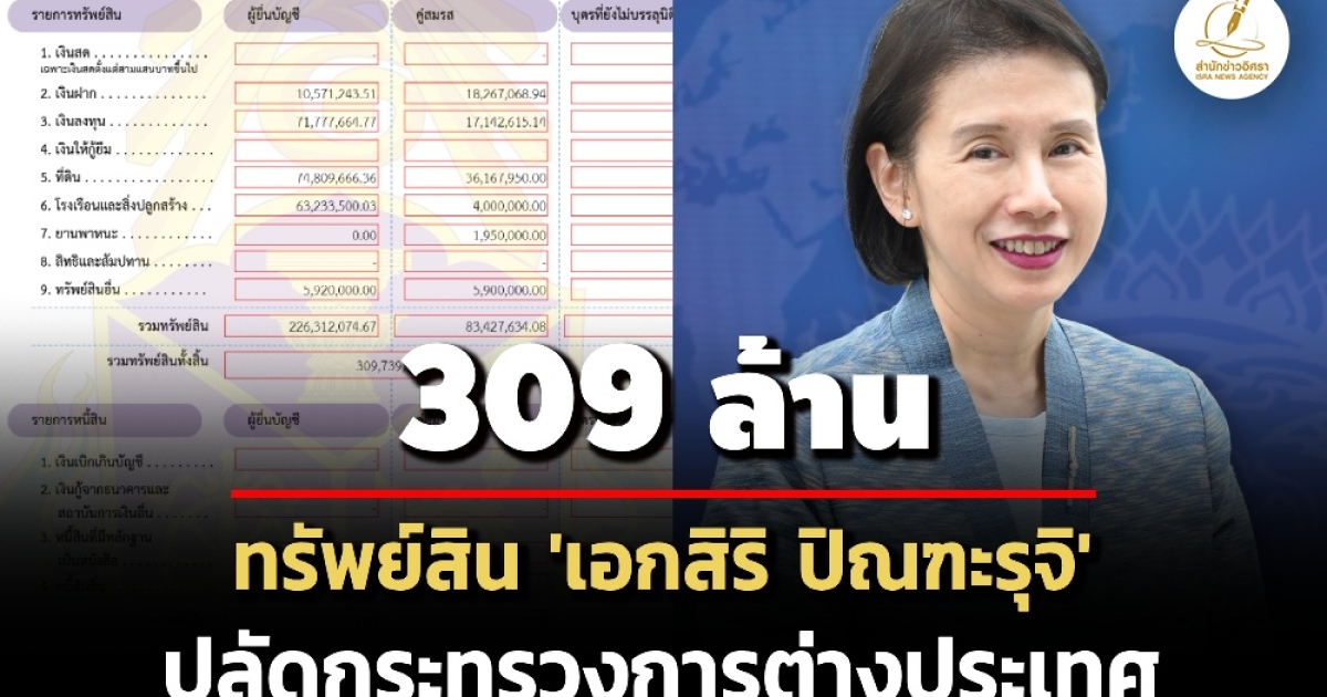 ป.ป.ช. เปิดทรัพย์สินผู้ดำรงตำแหน่งระดับสูง 'เอกสิริ ปิณฑะรุจิ' ปลัดกระทรวงการต่างประเทศ ทรัพย์สิน 309 ล. เงินลงทุน 71 ล. รายได้ 2 ล./ปี ไร้หนี้สิน