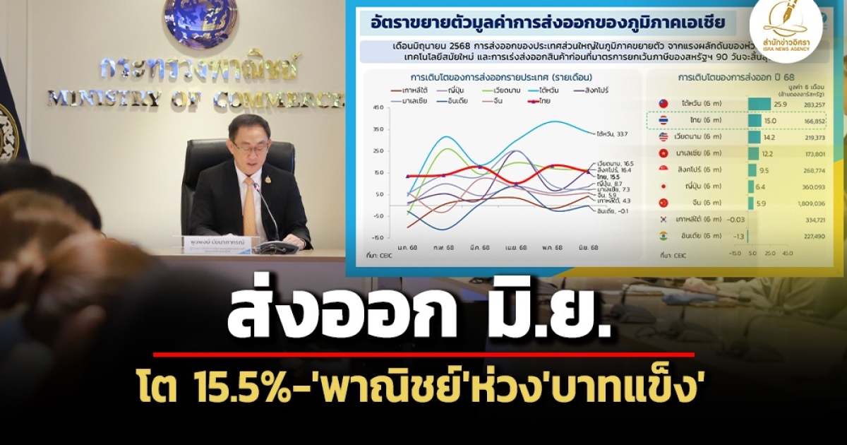 ‘สนค.’ เผยส่งออกไทยเดือน มิ.ย.68 ขยายตัว 15.5% จากปัจจัย ‘สหรัฐฯ’ เร่งสต๊อกสินค้า ส่งผลให้ 6 เดือนแรกโต 15% คาดครึ่งปีหลังส่งออกจะเริ่มชะลอตัว ห่วง 'บาทแข็ง' กระทบความสามารถในการแข่งขันของ 'สินค้าไทย'