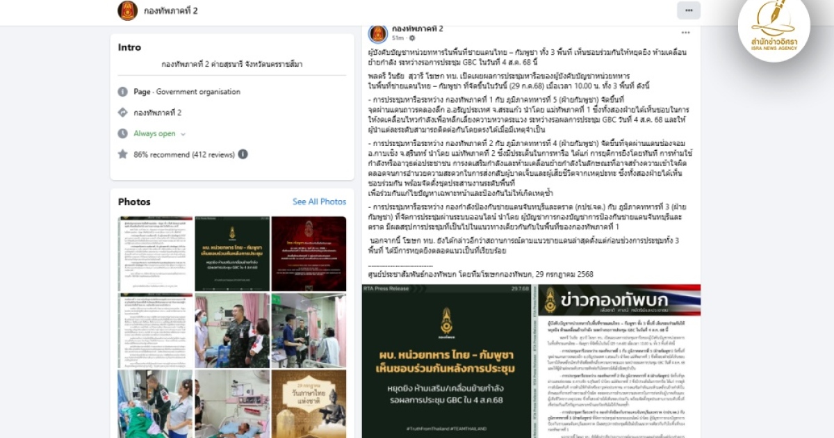 - การประชุมหารือระหว่าง กองทัพภาคที่ 1 กับ ภูมิภาคทหารที่ 5 (ฝ่ายกัมพูชา) จัดขึ้นที่จุดผ่านแดนถาวรคลองลึก อ.อรัญประเทศ จ.สระแก้ว นำโดย แม่ทัพภาคที่ 1 ซึ่งทั้งสองฝ่ายได้เห็นชอบในการให้งดเคลื่อนไหวกำลังเพื่อหลีกเลี่ยงความหวาดระแวง ระหว่างรอผลการประชุม GBC วันที่ 4 ส.ค. 68 และให้ผู้นำแต่ละระดับสามารถติดต่อกันโดยตรงได้เมื่อมีเหตุจำเป็น