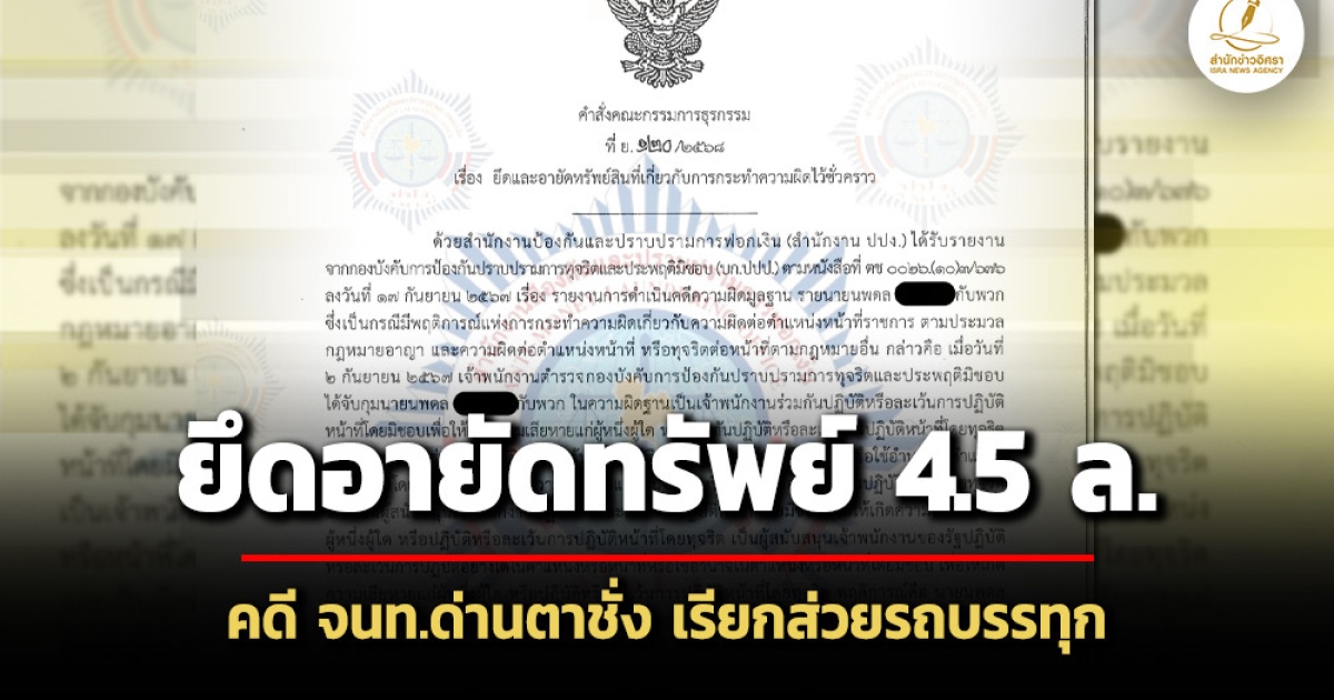 ปปง.ยึดอายัดทรัพย์ 4.5 ล้าน จนท.ด่านตาชั่งลอยกับพวก เรียกเก็บส่วยรถบรรทุกน้ำหนักเกิน แลกไม่ดำเนินคดี ทั้ง ห้องชุด บางแสน ที่ดิน 8 แปลง จ.เชียงใหม่ เงินฝาก รวม 15 รายการในชื่อ 5 บุคคล โดนร้อง ตร.ปปป. คดีอยู่ในชั้นอัยการ