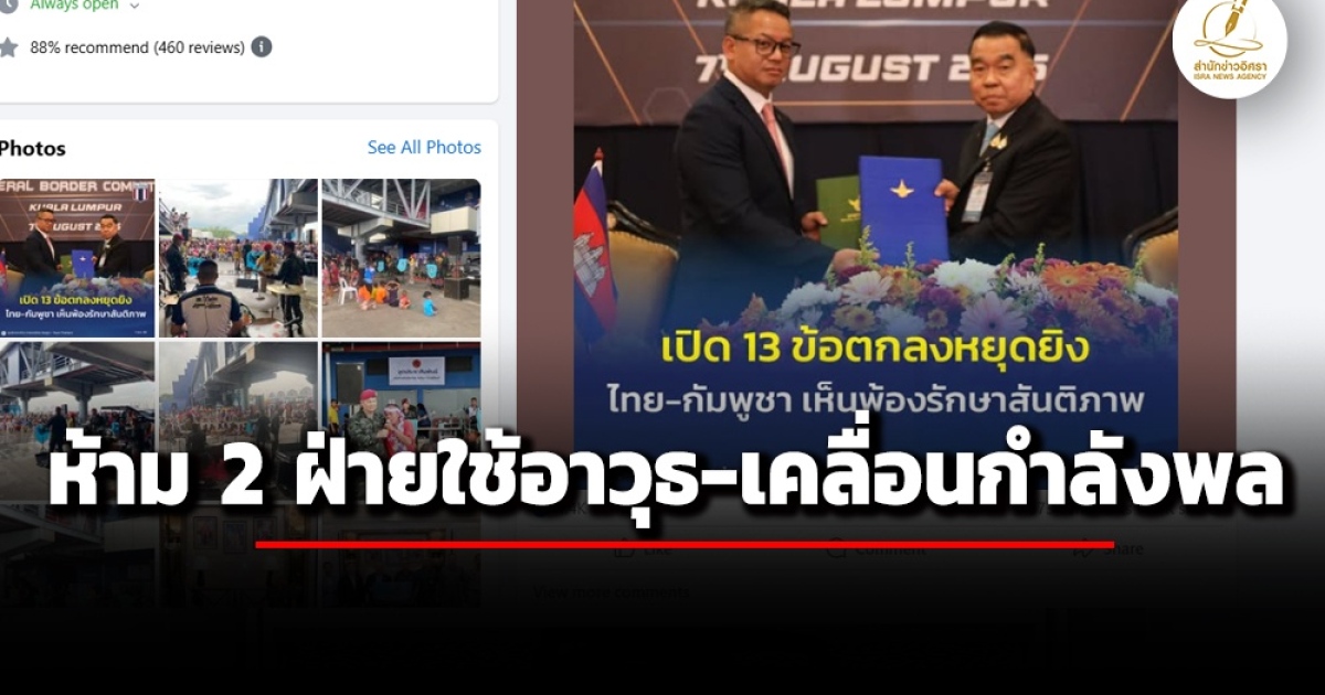 สำนักข่าวอิศรา (www.isranews.org) รายงานว่าเมื่อวันที่ 7 ส.ค. เฟซบุ๊กของกองทัพภาคที่ 2 ได้โพสต์รายงานความคืบหน้าการประชุมคณะกรรมการกิจการร่วมชายแดนหรือ GBC ระหว่างไทยและกัมพูชาที่กรุงกัวลาลัมเปอร์ ซึ่งเป็นการประชุมหลังจากที่ไทยกับกัมพูชาเจรจาหยุดยิงตามแนวชายแดนวันที่ 28 ก.ค.ที่ผ่านมา ระบุเนื้อหาว่าเสร็จสิ้นไปแล้ว สำหรับการประชุมคณะกรรมการชายแดนทั่วไป (General Border Committee: GBC) ไทย - กัมพูชา สมัยวิสามัญ ที่ 2 ชาติ เห็นพ้องข้อตกลงหยุดยิง 13 ข้อระหว่างกัน