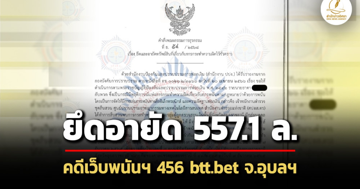 ปปง.ยึดอายัดทรัพย์บิ๊กลอต 557.1 ล. เว็บพนันฯ 456 btt.bet จ.อุบลฯ กลุ่มธาดา กับพวก ทั้งเงินสด ที่ดิน เงินฝาก 87 รายการ หลังตร.บุกค้นปลายปี 65 คดีอยู่ในชั้นศาล