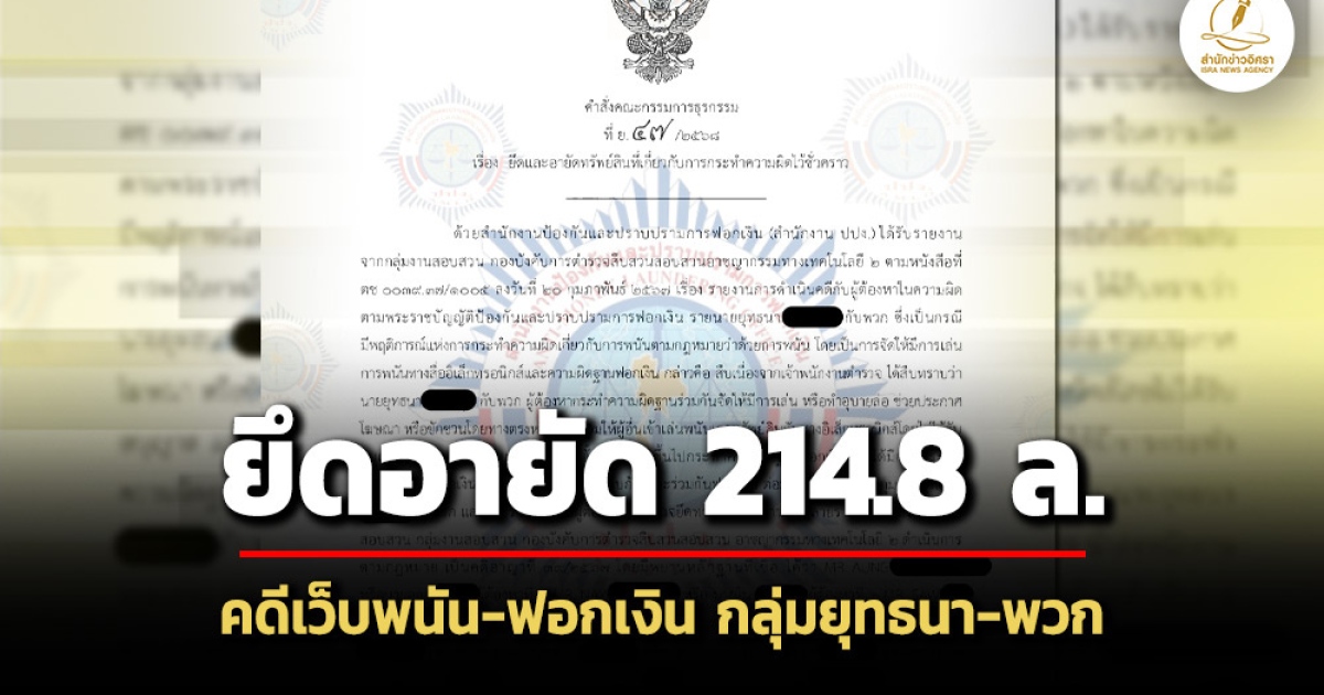 สำนักข่าวอิศรา (www.isranews.org) รายงานว่า สำนักงานป้องกันและปราบปรามการฟอกเงิน (ปปง.) มีคำสั่งคณะกรรมการธุรกรรมที่ ย 47/2568 ลงวันที่ 13 กุมภาพันธ์ 2568 เรื่อง ยึดทรัพย์สินที่เกี่ยวกับการกระทำความผิดไว้ชั่วคราว รายนายยุทธนา กับพวก ซึ่งเป็นกรณีมีพฤติการณ์แห่งการกระทำความผิดเกี่ยวกับการพนันตามกฎหมายว่าด้วยการพนัน โดยเป็นการจัดให้มีการเล่นการพนันทางสื่ออิเล็กทรอนิกส์และความผิดฐานฟอกเงิน
