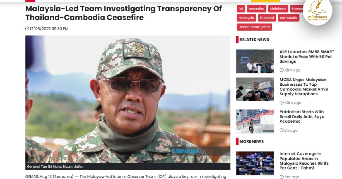 สำนักข่าวอิศรา (www.isranews.org) รายงานข่าวเกี่ยวกับสถานการณ์ความตึงเครียดชายแดนระหว่างไทย-กัมพุชา ว่า พล.อ. ตัน ศรี โมฮัมหมัด นิซาม จาฟฟาร์ ผู้บัญชาการทหารสูงสุดมาเลเซียได้ออกมาให้สัมภาษณ์เมื่อวันที่ 12 ส.ค. ว่าทีมผู้สังเกตการณ์ชั่วคราว (IOT) ซึ่งนำโดยมาเลเซีย จะมีบทบาทสำคัญในการสืบสวนความโปร่งใสของการหยุดยิงตามแนวชายแดนไทย-กัมพูชา