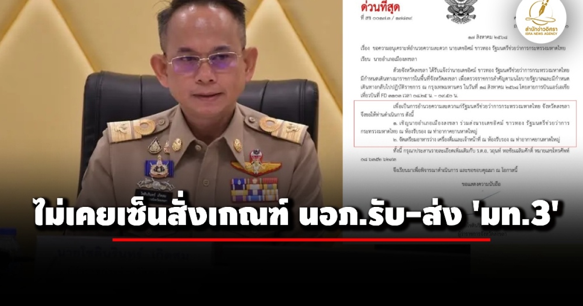 'โชตินรินทร์ เกิดสม' ผู้ว่าฯ สงขลา แจงไม่เคยลงนามหนังสือสั่งเกณฑ์ นอภ.รับ-ส่ง 'มท.3' ตรวจราชการรายสัปดาห์-ขอกาแฟ ด้าน 'เดชอิศม์ ขาวทอง'ยันเป็นเอกสารปลอมหวังดิสเครดิต ลั่นไม่ต้องการ เพราะเป็น สส.พื้นที่อยู่แล้ว - 'อิศรา' เปรียบเทียบเอกสารแจ้งบัญชีทรัพย์สิน ป.ป.ช.พบคนละลายเซ็น