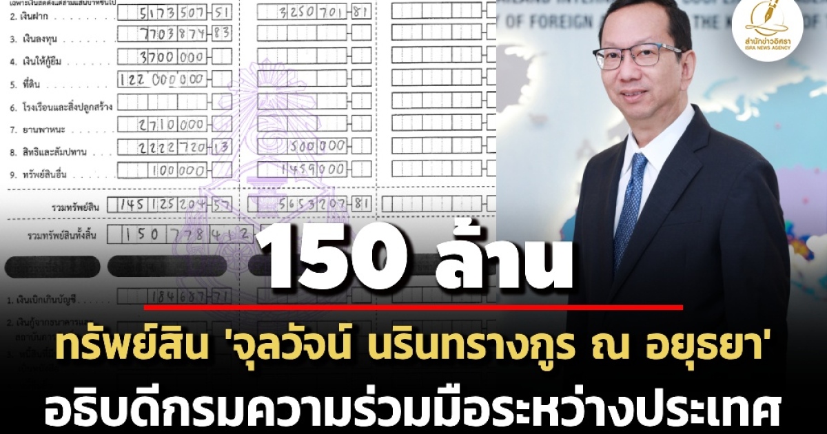 ป.ป.ช. เปิดทรัพย์สินผู้ดำรงตำแหน่งระดับสูง 'จุลวัจน์ นรินทรางกูร ณ อยุธยา' อธิบดีกรมความร่วมมือระหว่างประเทศ ทรัพย์สิน 150 ล. ที่ดิน 122 ล. รายได้ 1 ล./ปี